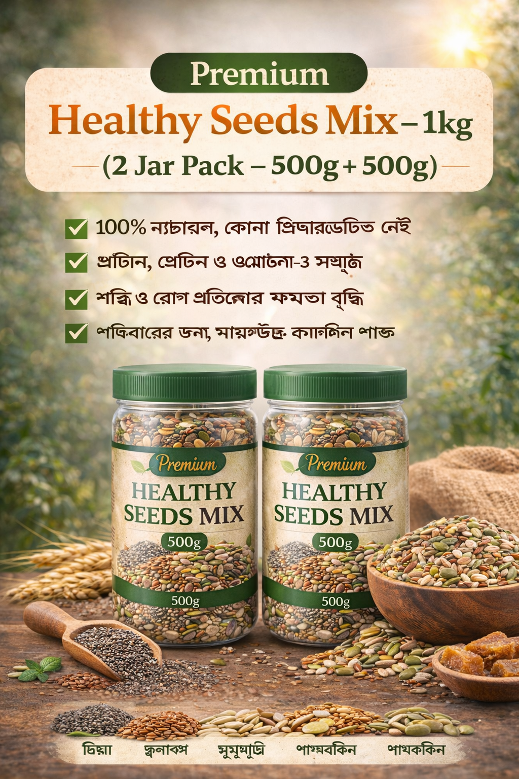 Premium Healthy Seeds Mix ১ কেজি প্যাক, সুবিধাজনক ২টি জার (৫০০g + ৫০০g)। ফাইবার, প্রোটিন ও ওমেগা-৩ সমৃদ্ধ এই ন্যাচারাল সিডস মিক্স প্রতিদিনের স্বাস্থ্যকর খাদ্যাভ্যাসের জন্য আদর্শ। ১০০% প্রাকৃতিক, কোনো প্রিজারভেটিভ নেই।